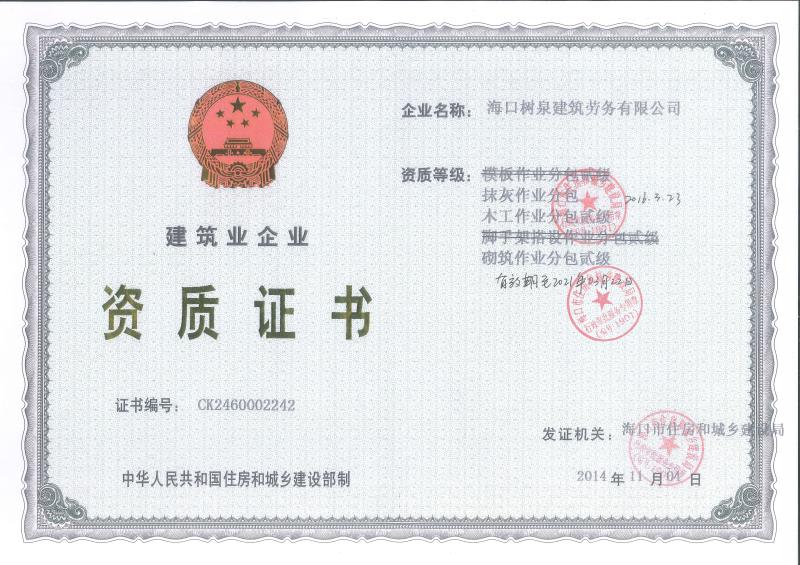 海口樹泉建筑勞務有限公司成立于2011年,公司位于??冢淝吧硎且患覍I建筑施工隊,自2004年即開始在海南從事建筑勞務施工。自成立至今,公司已經擁有一支科學管理、質量過硬、能打硬仗,搶工期的專業隊伍。能獨立承擔大中型工業與民用建筑 、室內外裝修、各類機電設備安裝工程。代表工程有海口濱海華庭、三亞時代海岸T01/02/04/05棟高層、合肥東?;▓@二期、陵水富力灣B區高層、三亞金中海(酒店)、瓊海大印經典花園、??诃h球海景大酒店(四星級酒店,在建中)、陵水珍珠大廈(五星酒店)、??谌f達廣場、美蘭機場二期。